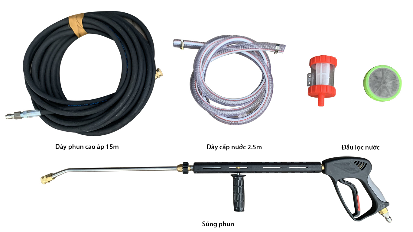 - Sản phẩm bao gồm: dây phun 15m, dây cấp nước, đầu lọc nước, súng phun